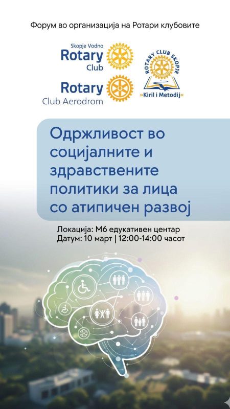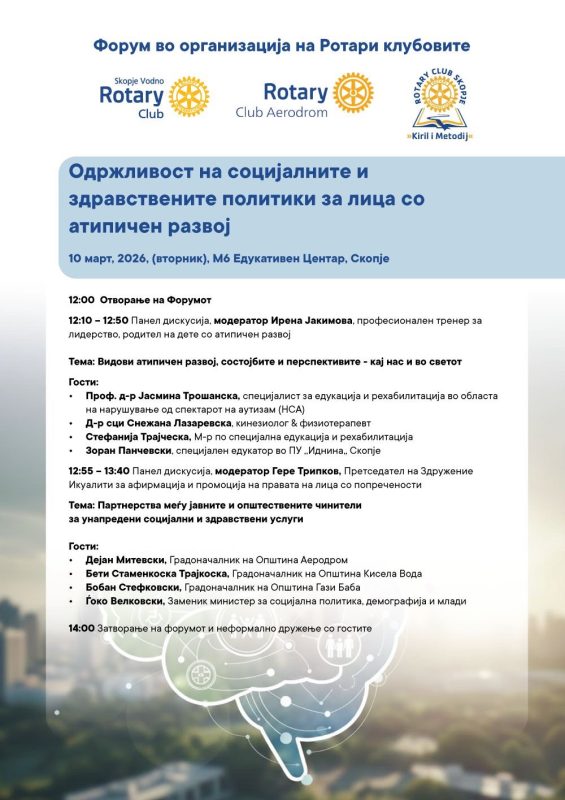 Форумот „Одржливост на социјалните и здравствените политики за лица со атипичен развој“ ќе се одржи денеска од 12 до 14 часот во М6 Едукативен центар во Скопје. Настанот е организиран со поддршка на три ротаријански клубови, а на него ќе учествуваат и претставници од Здружението „Икуалити“.