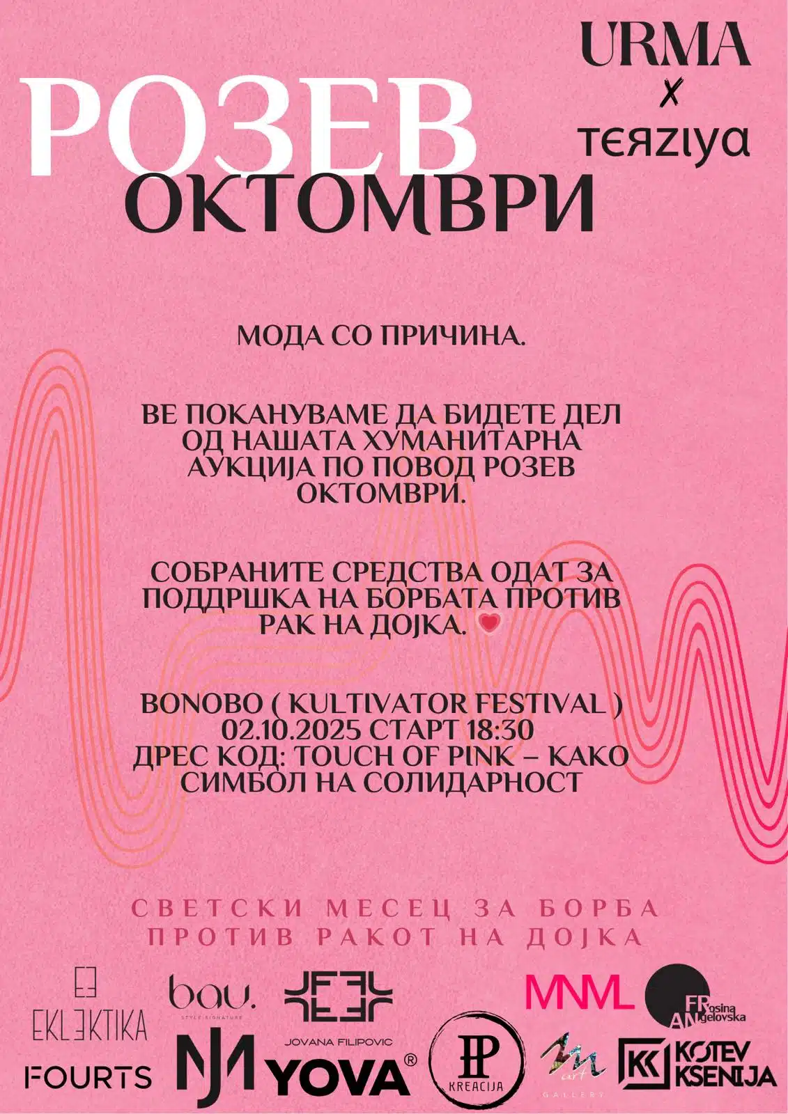 По повод октомври, месецот на свесност и борба против ракот на дојка, концепт продавницата „URMA“ и модниот бренд „Terzyia“ организираат хуманитарна аукција на ексклузивни дизајнерски парчиња насловена „Розев октомври“. Настанот се одржува во рамките на фестивалот „Култиватор“, а ќе биде на 2-ри октомври во кафулето „Bonobo hi fi“ во Скопје, со почеток во 18.30 часот.