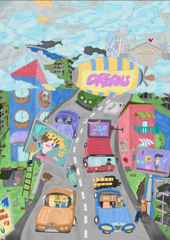 – Делото е инспирирано од искуствата на младите денес, кога за напредок често се бараат врски наместо знаење. Цртежот прикажува што се случува „зад нашите грбови“, додека навистина е пред нас – систем кој фаворизира мажи и богатите, додека жените и малцинствата мора да докажуваат своја вредност. Пораката е јасна: преку глава ни е! Младите заслужуваме почит и шанса да напредуваме – да живееме, а не само да преживуваме – вели Ќурчинска.