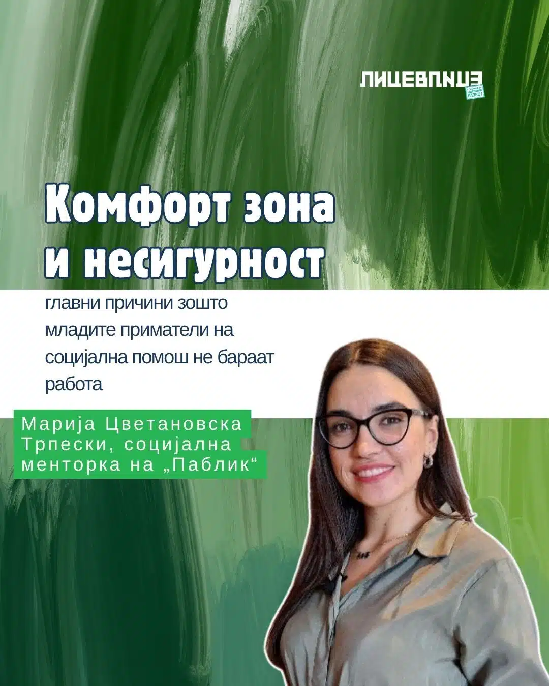 Марија Цветаноска – Трпески работи како социјална менторка во организацијата „Паблик“. Таа секојдневно е во контакт со млади приматели на ГМП (социјална помош). Нејзината задача е да им помогне да ги препознаат сопствените способности, да излезат од стагнацијата и да направат чекор кон економска независност.