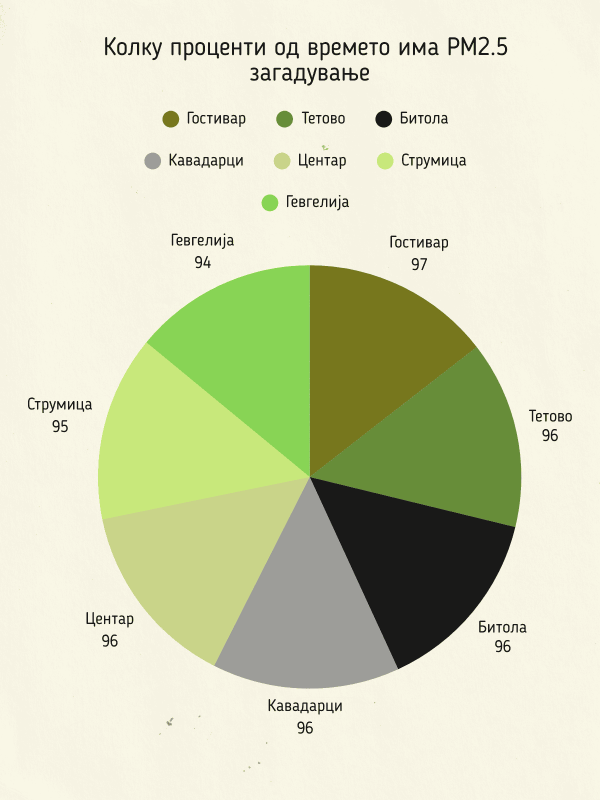 На жителите на Тетово, Битола, Кавадарци и Центар оваа „привилегија“ им била достапна 15 дена од целата година, а струмичани имале три дена повеќе од нив. Со задршка се дишело дури во најчистото Лазарополе, бидејќи загадувањето стигнало дури до таму.