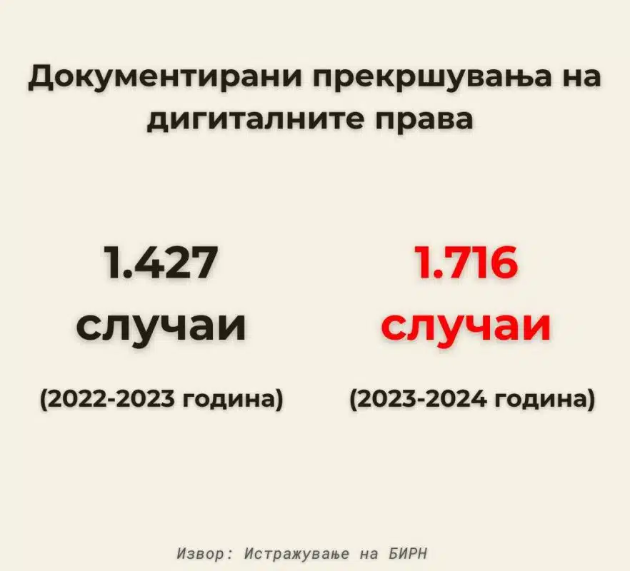 Од септември 2023 до август 2024 година, БИРН евидентираше 366 случаи на повреда на дигитални права во Северна Македонија. Во поголемиот дел од случаите (298), жртви на нападите биле граѓани, додека државните институции биле цел во 51 случај. Во 200 случаи, самите граѓани биле наводни сторители на онлајн напади, додека во околу една третина од случаите (110) сторителите останале непознати.