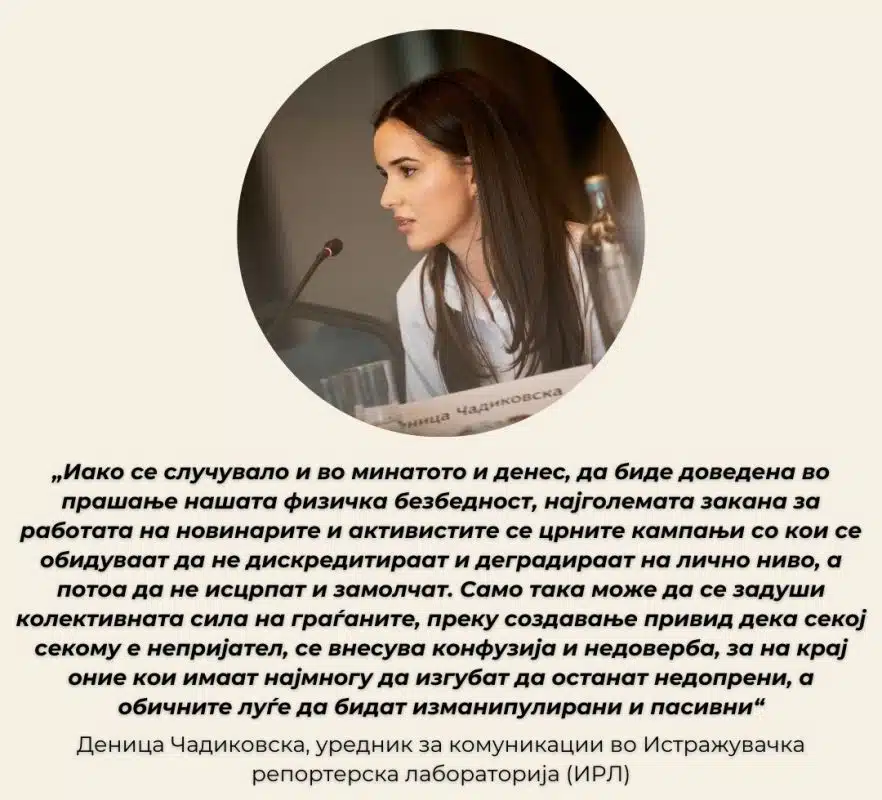 Онлајн нападите на социјални мрежи, нарачани од различни центри на моќ и медиумските хајки од лица кои се претставуваат себеси како новинари, а всушност негуваат тесни релации со политички и економски моќните, станаа дел од нашето секојдневие – вака, Деница Чадиковска, уредничка за комуникации во Истражувачката репортерска лабораторија (ИРЛ), ја опишува ситуацијата.