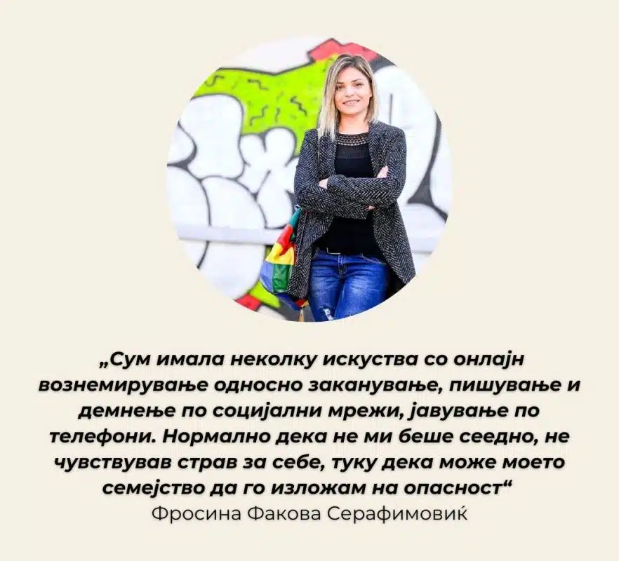 Сум имала неколку искуства со онлајн вознемирување односно заканување, пишување и демнење по социјални мрежи, јавување по телефони со прашања зошто сум објавила нешто, со наредби да го избришам текстот на којшто работам итн. Поранешен министер преку порака на Вибер ми порача да го избришам текстот каде што се споменува тој. Би го издвоила случајот кога еден сведок во судски случај ми напиша „к***о, која си ти да ме пишуваш“ – споделува новинарката Фросина Факова Серафимовиќ.