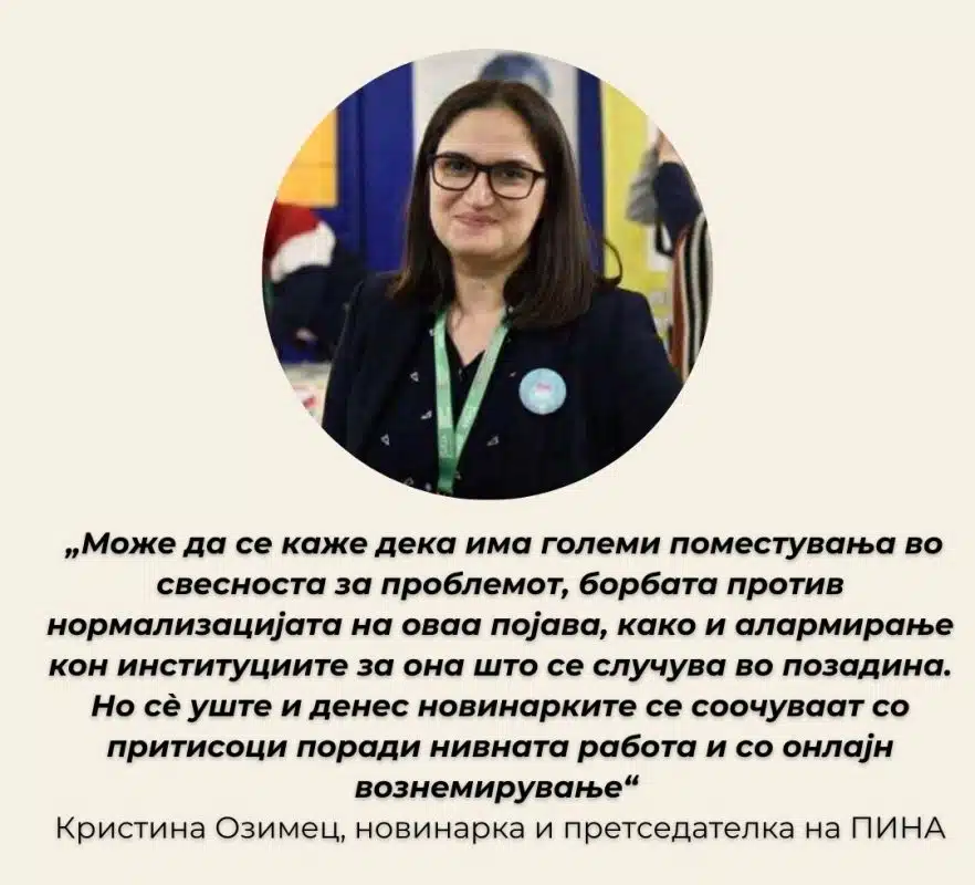 Во моментот немаме толку опсежни податоци за сегашната состојба. Но со нашите активности со мрежата која ја опфаќа Програмата за жени новинари на ПИНА, имаме редовни контакти, средби и директна работа со значаен број на новинарки од цела Македонија, од каде и ги црпиме сознанијата за сите предизвици со кои се соочуваат новинарките и денес – вели Кристина Озимец, новинарка и претседателка на ПИНА, организација која со години ги актуелизира прашањата во јавноста кои ги засегаат жените во медиумите, нуди поддршка и поврзување на новинарките, како и да го подобрува нивниот напредок и позицијата во медиумите.