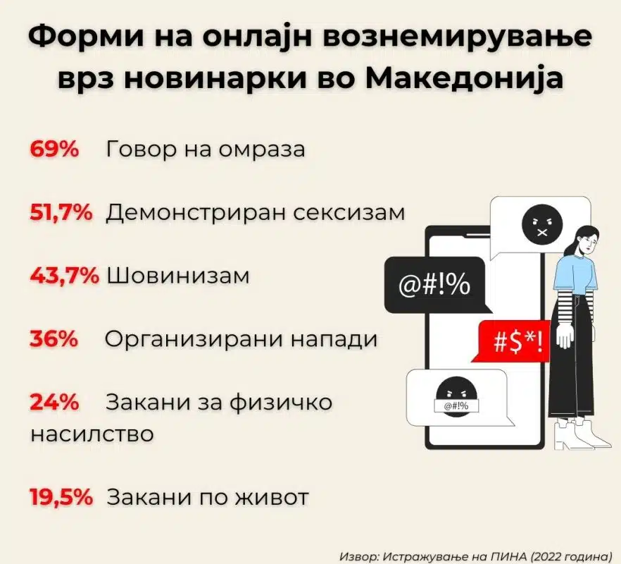 Од новинарките во Македонија, 81% се соочиле со некаква форма на онлајн вознемирување поради нивната работа, покажа истражувањето базирано на анкети со над 100 новинарки од домашната медиумска сцена кое го спроведе Платформата за истражувачко новинарство и анализи (ПИНА) во 2022 година.