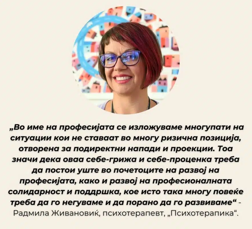За жал, повторно сето ова е оставено да се самоорганизира. Како општество не сме спремни да зборуваме и да работиме на професионалните ризици и оптоварувања, и повеќе сме свртени кон продуктивност и сензационализам. Првите чекори се секогаш многу порано отколку што можеме да видиме. Она што гледаме е најчесто веќе експлозија на набилданата тензија и фрустрација, несвесни дека сме можеле многу порано да се заштитиме. Генерално немаме искуство што значи да се грижиш за себе и да се заштитиш – оценува Живановиќ.